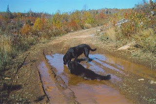 Somehow I felt safer when Quincy joined us. I knew he was bush-savvy. He moved like he had spent his life running free in the wilderness. Mud puddles were his weakness. Any we found along the way, the bigger the better, he would sit in those as he did the river, then stretch out and lie there as though he had found a little slice of heaven.