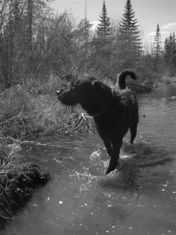 In the deepest spots the water is up past Murdoch’s knees and he wades noisily through them, scooping up great mouthfuls of water, snapping his jaws like a hungry alligator. He won’t lie in the puddles like Bear or Jack, who both wallow happily in the midst of the muddiest water, but if I let him I think he would drink every last drop.
